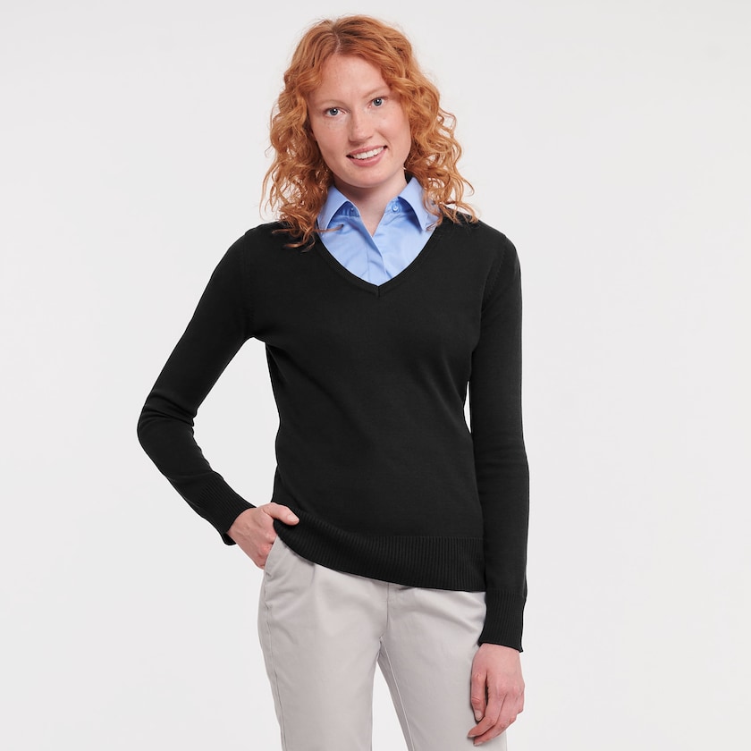 Elegant strikket trøje til kvinder. Trøjen har en v-hals, og er fremstillet i en Easy Care bomuldsblanding. Dette kombinerer bomuldens lethed med akrylens blødhed. Trøjen kan tørretumbles, og maskinvaskes op til 40 grader. En elegant trøje til dig som søger et mere velklædende alternativ. Leveres enkeltvis pakket i plastikpose. Findes også som herremodel.