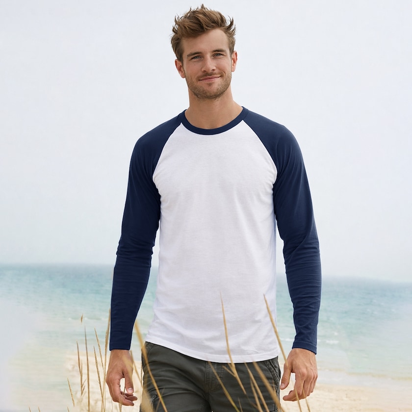 Langærmet baseballtrøje fra Fruit of the Loom. Trøjerne leveres pakket enkeltvis i plastpose.