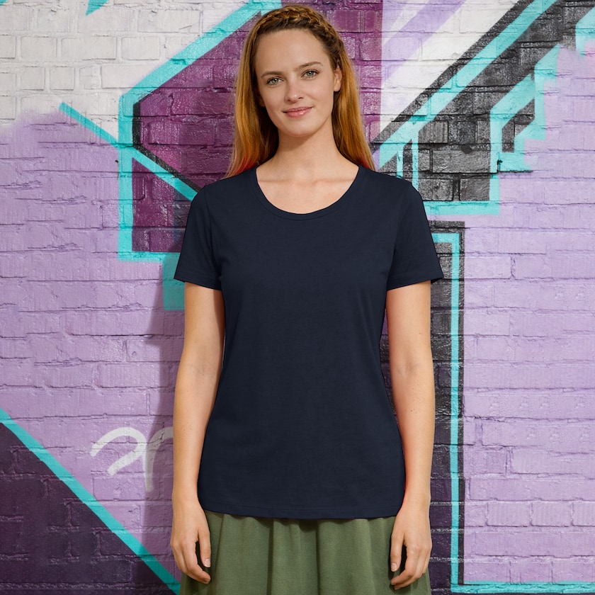 Figursyet t-shirt til damer lavet af 100% økologisk bomuld. Trøjerne har et rent design og feminim pasform. Trøjerne leveres enkeltvis pakket i plastposer. Findes også som herremodel.