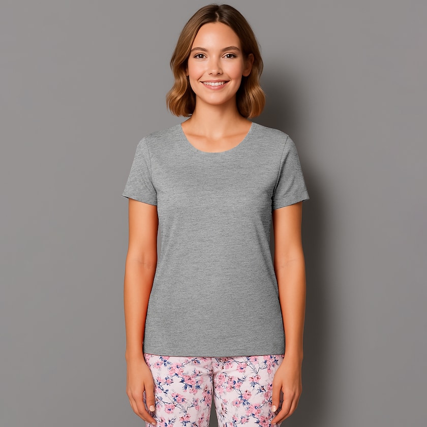 Dame-t-shirt i et lækkert blødt bomuldsstof. Stoffet er fremstillet af 100% bomuld og har en vægt på 185 gram/m². Farven heather grey er fremstillet af 85% bomuld og 15% viskos. Findes også som herremodel.