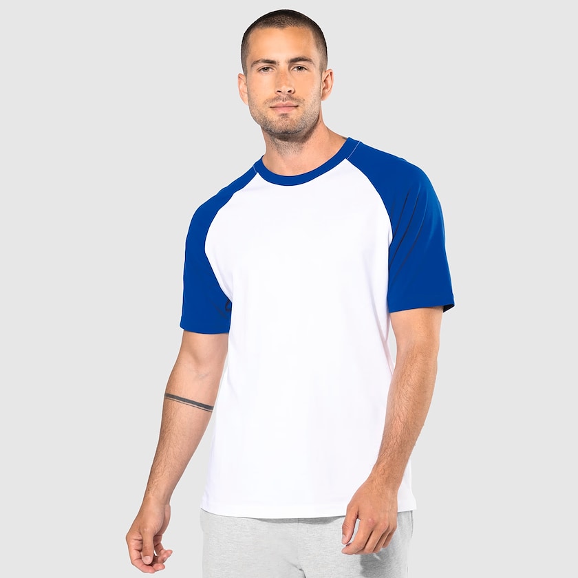 Sporty t-shirt med kontrastfarvede ærmer og hals. Trøjen er lavet af 100% bomuld. De trykte trøjer leveres enkeltvis pakket i plastikpose.