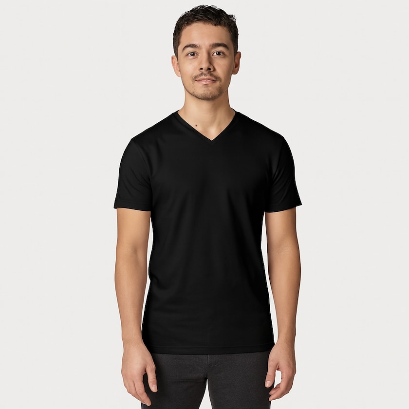 V-formet t-shirt af økologisk bomuld. Trøjen er fremstillet i et 200 grams bomuldsstof af høj kvalitet. Stoffet indeholder 5% elastan for øget stretch og blødhed. Findes også som damemodel.