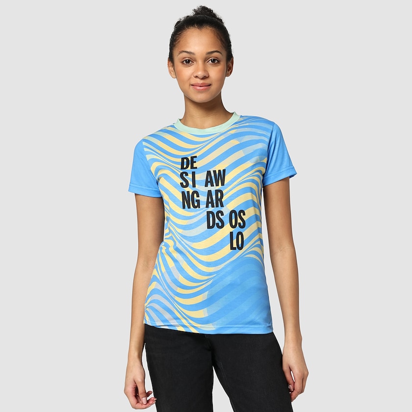 Specialfremstillet dame-t-shirt i polyester der føles som bomuld. T-shirten er produceret af et hvidt 145 grams polyesterstof. Hele stoffet digitaltrykkes efter dine instruktioner og sys derefter sammen til en t-shirt. Det betyder, at du har et ubegrænset antal tryk og trykfarver, samt tryk der går helt ud til sømmene. T-shirten fås i størrelserne XS til 4XL. Minimumsmængden pr. størrelse er 5 stk. Størrelsestolerancen er +/- 1,5 cm, og vi forbeholder os retten til, at den leverede mængde kan afvige +/- 5%. Leveret mængde faktureres. Da t-shirten er specialfremstillet, er leveringstiden længere end normalt. Findes også som herremodel.