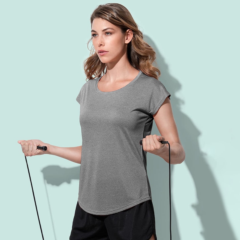 Miljøvenlig træningstøj til kvinder. T-shirten er produceret i ACTIVE DRY polyester hvoraf 50% er genanvendt polyester. ACTIVE DRY-stoffet holder kroppen tør selv ved intensiv træning. Findes også som herremodel.