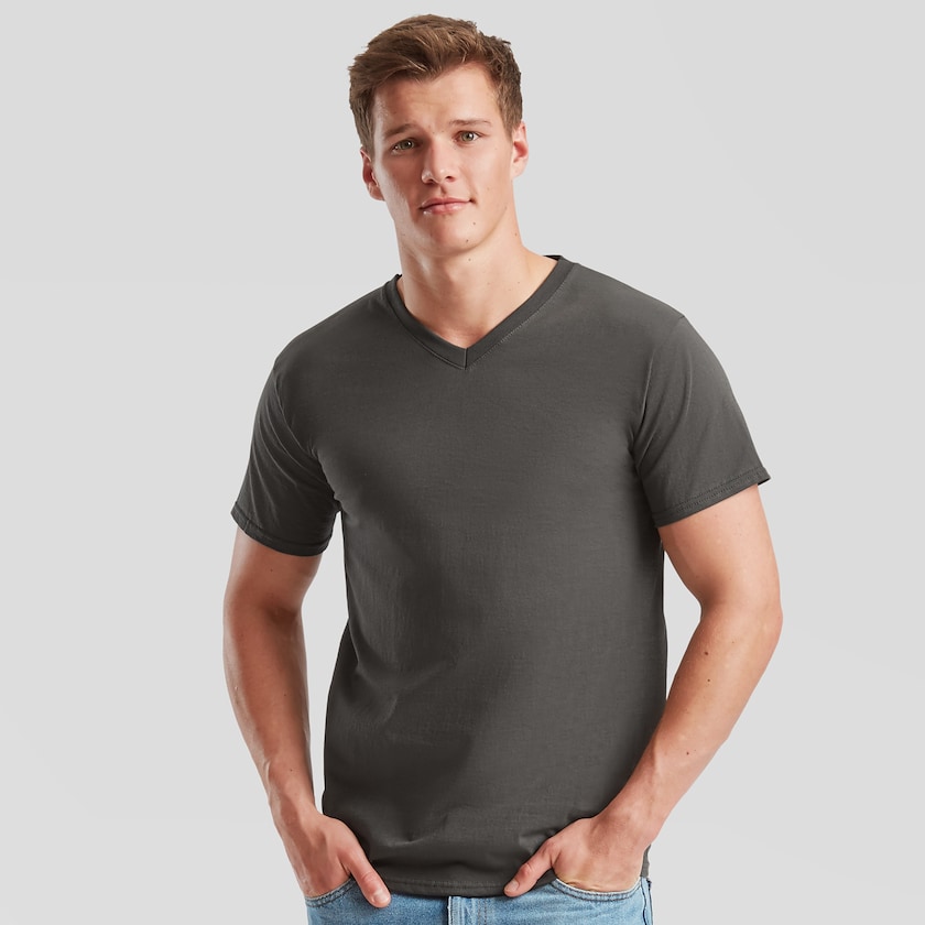 Prisbillig T-shirt med V-udskæring fra Fruit of the Loom. Trøjerne leveres pakket enkeltvis i plastpose. Findes også som damemodel.