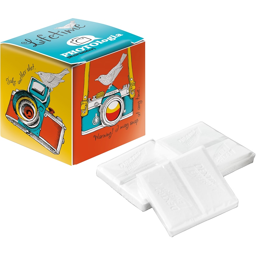 Papirterning fyldt med fem Dextro Energy-pastiller. Hele terningen trykket med dit logo. Download skabelonen og skab din unikke emballage.