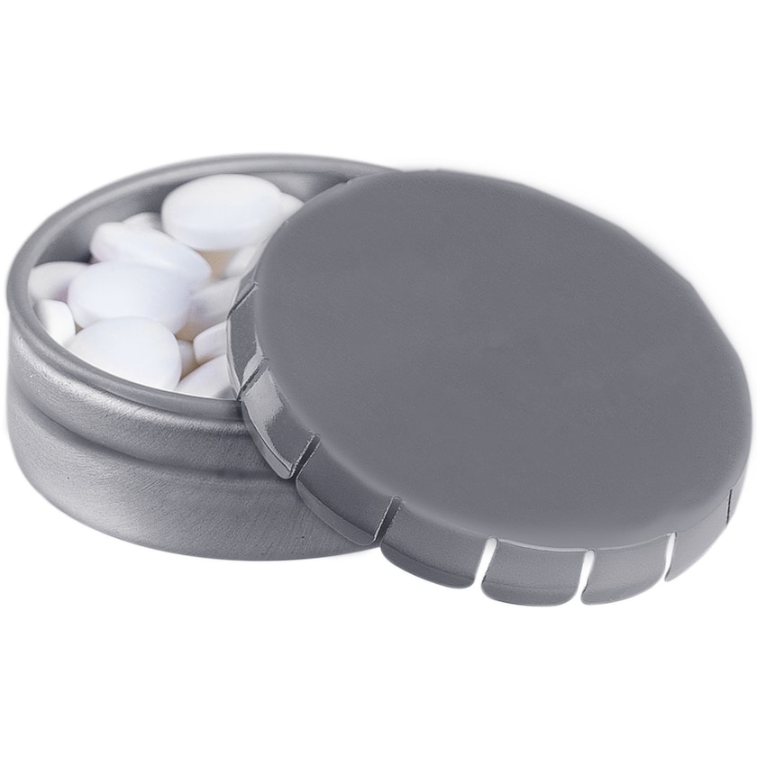 Den klassiske click-clack dåse fyldt med lækre mintpastiller. Ved tryk på midten af låget åbnes dåsen.