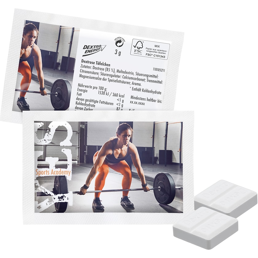 Pakke med to Dextro Energy Mini-tabletter. Hele emballagen trykkes efter dit ønske. En pakke springfyldt med energi!