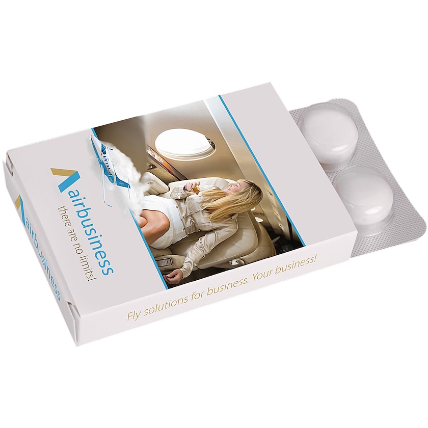 Digitaltrykt papæske med 6 mintpastiller i blisterpakke. Pastillerne er bløde og lette at tygge.
