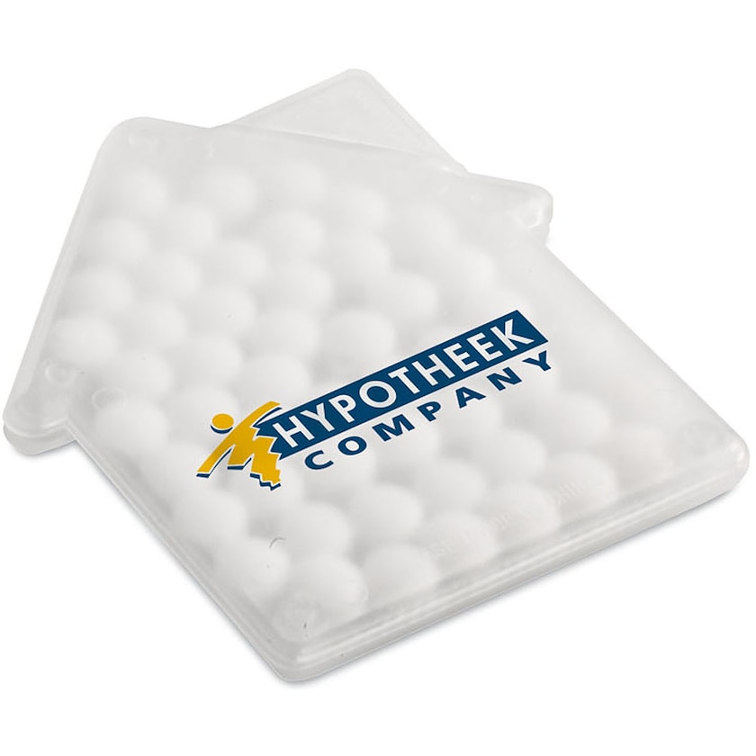 Sjov husformet æske i visitkortsstørrelse fyldt med ca. 50 sukkerfri mintpastiller.