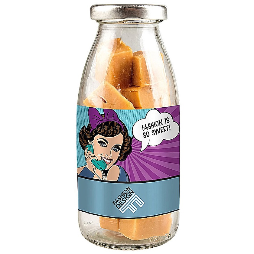Glasflaske fyldt med 140 gram lækker fudge. Etiketten trykkes med digitaltryk og designes helt efter dine ønskemål. Et sjovt og anerledes alternativ til en chokoladeæske.