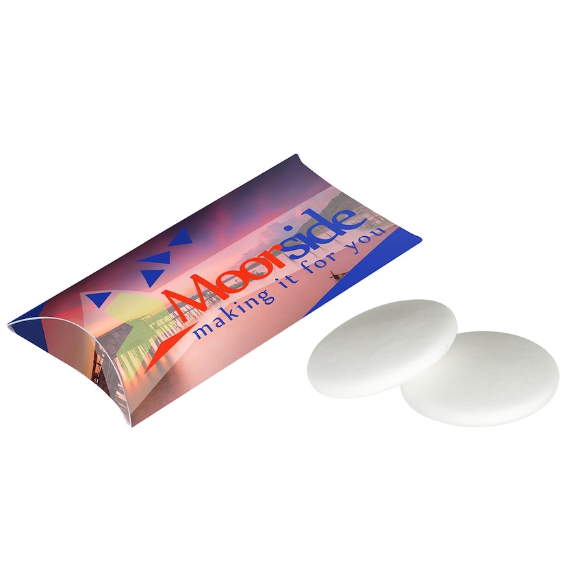 Lille papæske med to forfriskende mintpastiller. Emballagen designes helt efter dine ønsker.