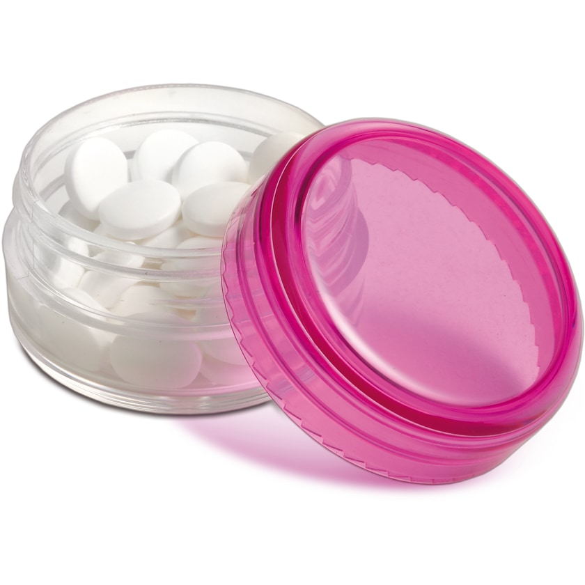 Dåse med ca. 12 gram sukkerfri mintpastiller med pebermyntesmag. En unik slikdåse der giver stor reklame til en mindre pris.