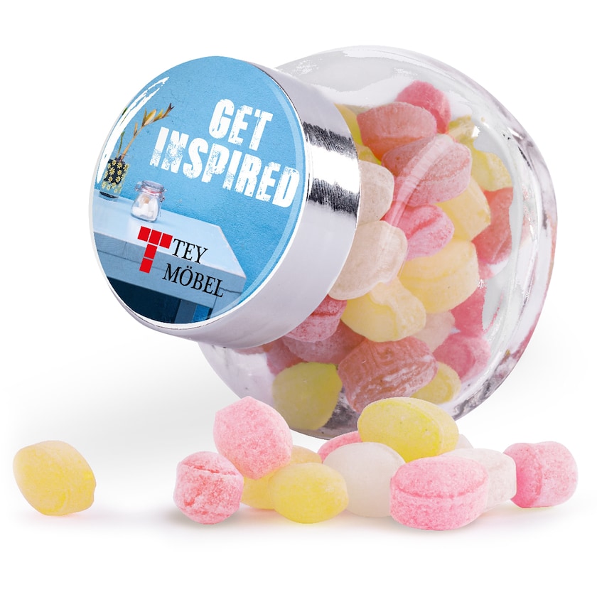 Lille slikdåse med stor wow-effekt! Slikdåsens låg forsynet med en digitaltryks domæne etiket med dit logo. Bolcherne har blandet smag og er produceret i Tyskland.