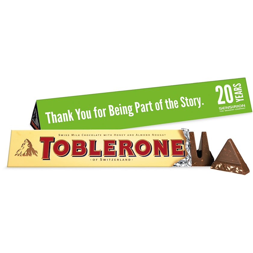 100 gram chokoladebar fra schweiziske Toblerone. Vælg mellem tre forskellige smage. Chokoladebaren placeres i et papetui med dit tryk.