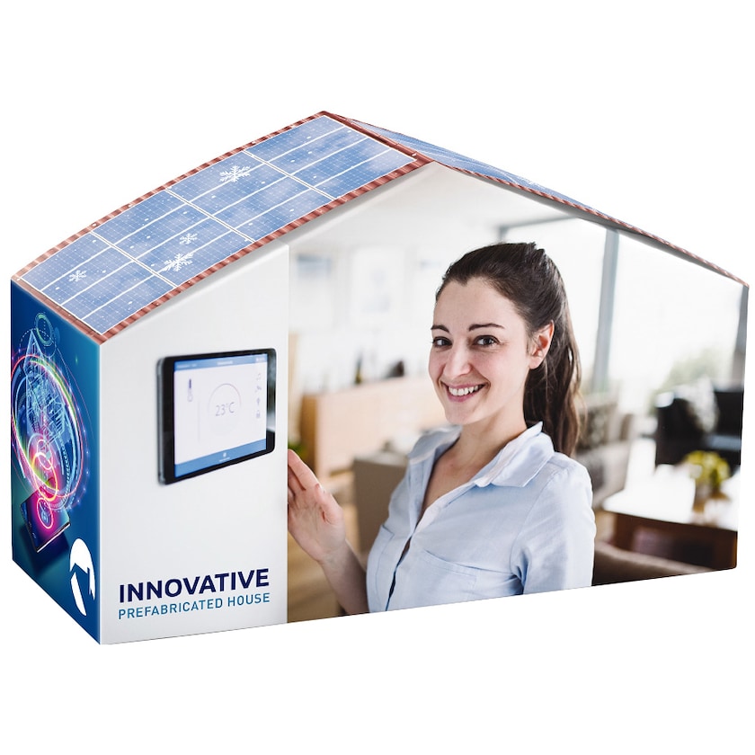 Hus der fyldes med enten slik eller chokolade. Huset er produceret af FSC-certificeret papir og trykkes helt efter dine ønsker. Vælg frit mellem følgende fyld: Mentos chewy candy (36,5 gram, 12 måneders holdbarhed), Ritter Sport chokolade (60 g, 6 måneders holdbarhed) eller Lindt Lindor milk balls (50 gram, 6 måneders holdbarhed).