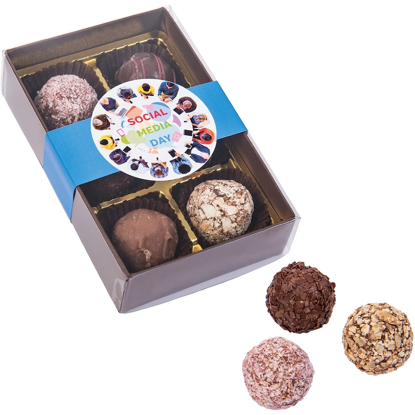 6 stk. chokoladepraliner i chokoladeæske med transparent låg. Chokoladepralinerne laves på bestilling og kommer i blandede smagsvarianter. Chokoladeæske forsynes med et band som trykkes efter dit ønske.