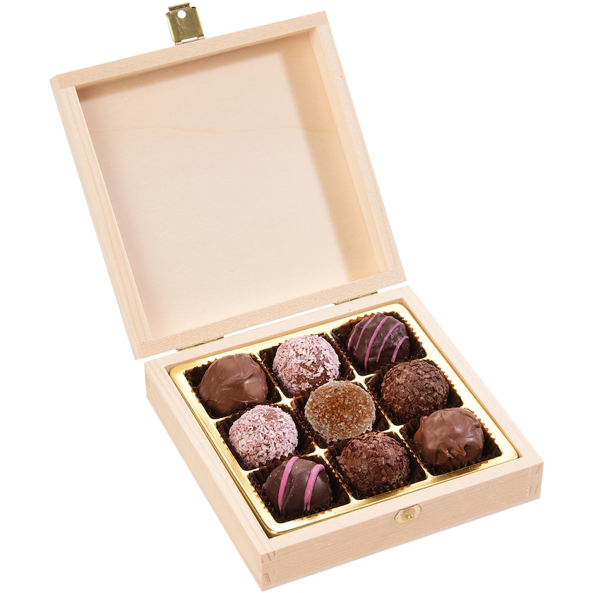 9 stk. chokoladepraliner af belgisk chokolade i en flot trææske. Chokoladepralinerne laves på bestilling hvilket gør at de altid er helt friske. Leveres med blandet smagsvarianter. Trææskens låg trykkes efter dine ønsker.