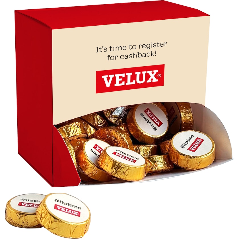 Lille papæske fyldt med runde chokolader i guldfolie. Chokoladerne har 50% kakaoindhold og smager fantastisk. Trykprisen henviser til tryk på hele papæskens overflade samt tryk på etiketterne på chokoladerne.