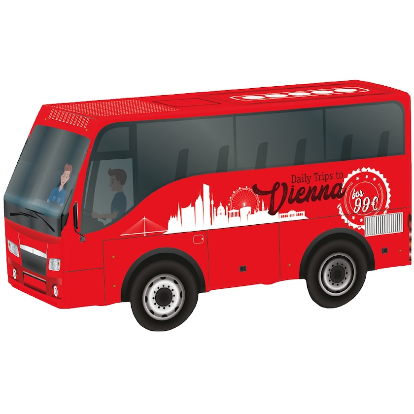 Bus fyldt med enten slik eller chokolade. Bussen er produceret af FSC-certificeret papir og trykkes helt efter dine ønsker. Vælg frit mellem følgende fyld: Mentos chewy candy (36,5 gram, 12 måneder holdbarhed), Ritter Sport chokolade (60 g, 6 måneders holdbarhed) eller Lindt Lindor milk balls (50 gram, 6 måneders holdbarhed).