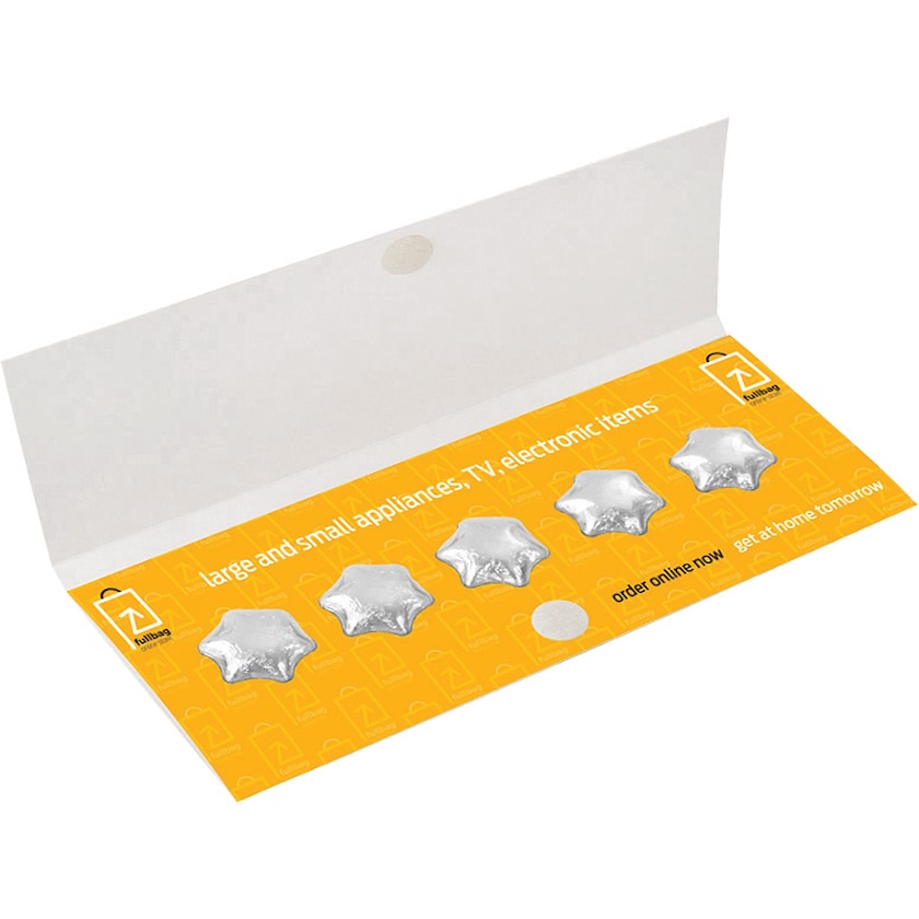 Chokoladeæske med fem chokoladestjerner af kvalitetsmælkechokolade. Hele emballagen trykkes efter dine ønsker og du kan vælge mellem rød, sølv eller guldfarvet folie.