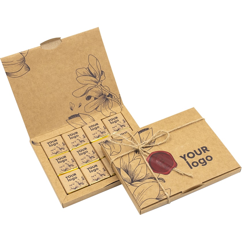 Stor naturfarvet chokoladeæske med 12 stk. chokolader. Hele æsken samt chokoladerne trykkes efter dine instruktioner. Chokoladerne kan enten fås som mælkechokolade eller mørk chokolade. Du bestemmer selv om du vil have chokoladerne med sølv- eller guldfolie. Chokoladeæsken er ombundet med snor og klistermærke. Klistermærken har et færdigtrykt der ligner et rødt vokssegl, som hvis du ønsker det, kan forsynes med din logotype.