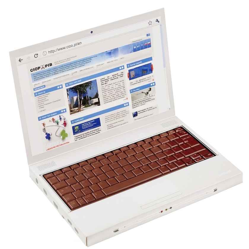 Chokoladeæske formet som en bærbar. Selve chokoladen er formet som et tastatur. Hele æsken designes og trykkes i forhold til dine ønsker. En sjov chokoladeæske til alle IT-virksomheder!