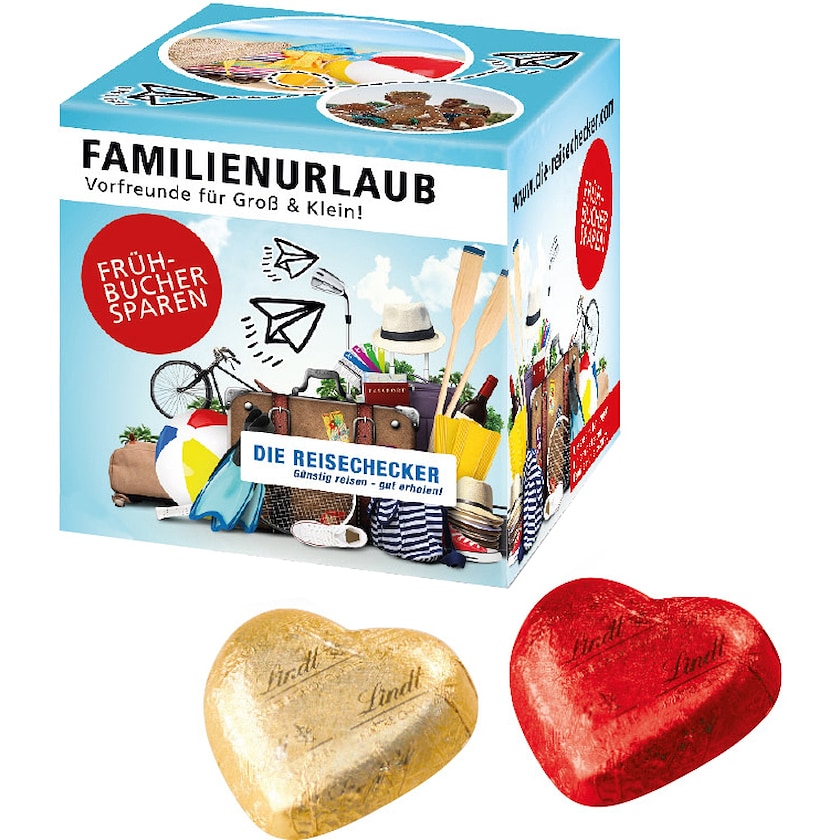 Lille gaveæske med eget logo som er fyldt med 5 stk. chokoladehjerter fra Lindt. Alle æskens sider trykkes med digitaltryk. En lille chokoladeæske fyldt med kærlighed og lækker mælkechokolade.