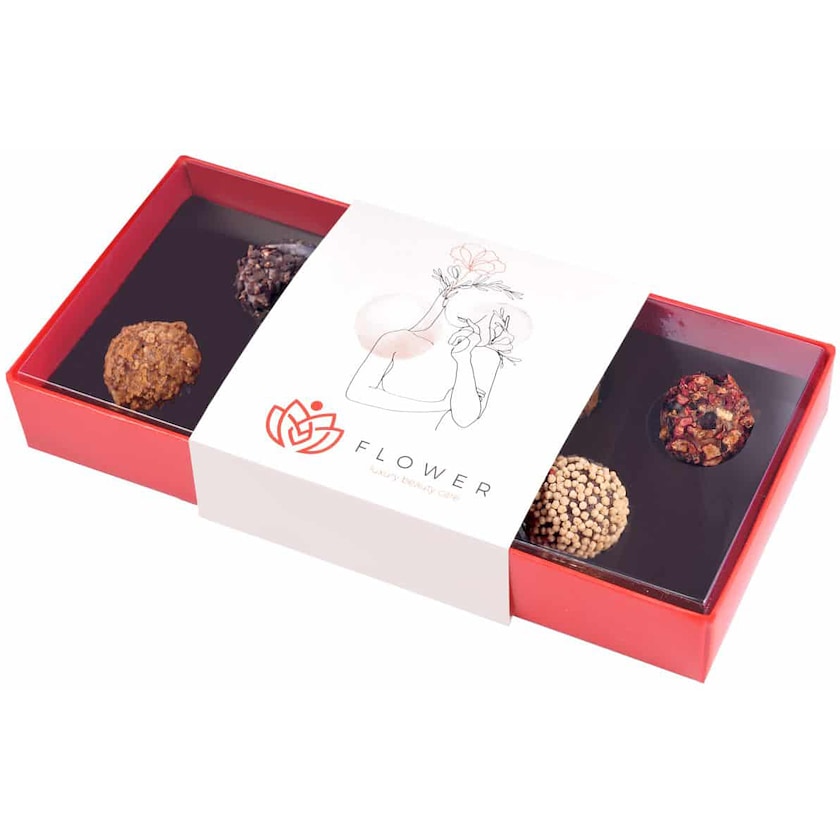 Chokoladeæske med 8 stk. luksuriøse chokoladetrøfler. Chokoladetrøflerne kommer i blandet smagsvarianter som cherry, dark orange, calvados og passion fruit. Rundt om chokoladeæsken er der placeret en banderoll som trykkes helt efter dine ønsker. Du bestemmer helt selv trykket på papæsken og dens inderside.