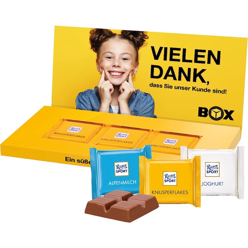 Chokoladeæske fyldt med tre Ritter Sport Mini. Hele chokoladeæsken designes efter dit ønske. Kommer som standard blandet med smagsvarianterne alpenmilch, joghurt, knusperflakes, marzipan og nuss-splitter. Hvis det ønskes kan man også blot vælge en smagsvariant.
