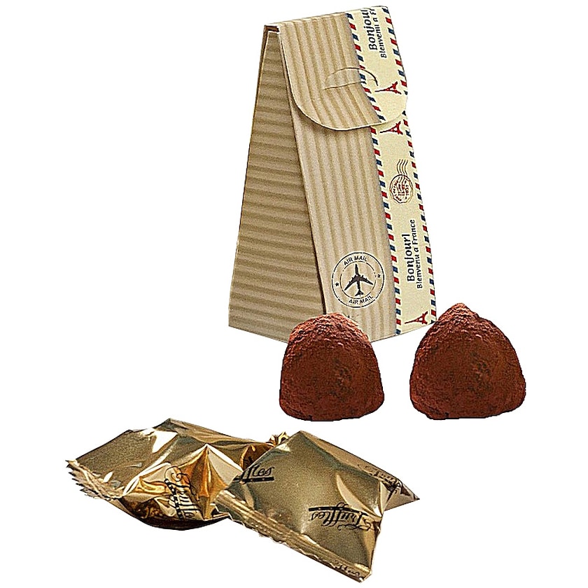 1 stk. chokoladetrøffel i en papæske med eget logo. Chokoladetrøflerne er produceret i Frankrig og er lavet af førsteklasses mørk chokolade. Æsken trykkes med digitaltryk, og designes helt efter dine ønskemål.