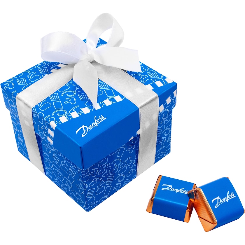 Chokoladeæske fyldt med 16 stk. fyldte chokoladepraliner. Chokoladepralinerne fås i en af smagsvarianterne chokolade, pistacie og blandet smag. Både chokoladeæsken og banderne rundt om chokoladepralinerne forsynes med dit tryk. Chokoladeæsken forsynes desuden med et silkebånd i valgfri farve.