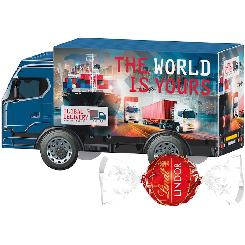 En lastbil fyldt med 3 stk. Lindt Lindor-praliner. Hele overfladen trykkes efter dine ønsker. Fremstillet af miljømærket papir.