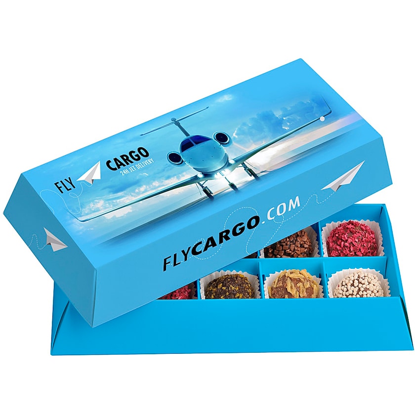 Chokoladeæske med 10 chokoladepralinere af høj kvalitet. Hver chokoladepraliner vejer ca. 8,5 gram. Smagene er blandede. Hele æsken trykkes med digitaltryk efter dine ønsker. En luksuriøs chokoladeæske med pralinere af absolut højeste kvalitet!