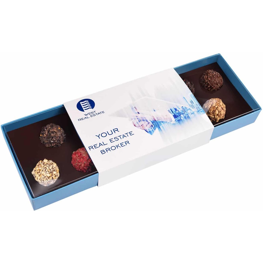 Chokoladeæske med 12 stk. udsøgte chokoladetrøfler. Chokoladetrøflerne kommer i blandet smagsvarianter. F.eks. smagsvarianter som cheesecake, cranberry, caramel og passion fruit. Trykket laves på en banderoll som placeres rundt om chokoladeæsken. Du bestemmer helt selv trykket på papæsken og på dens inderside.
