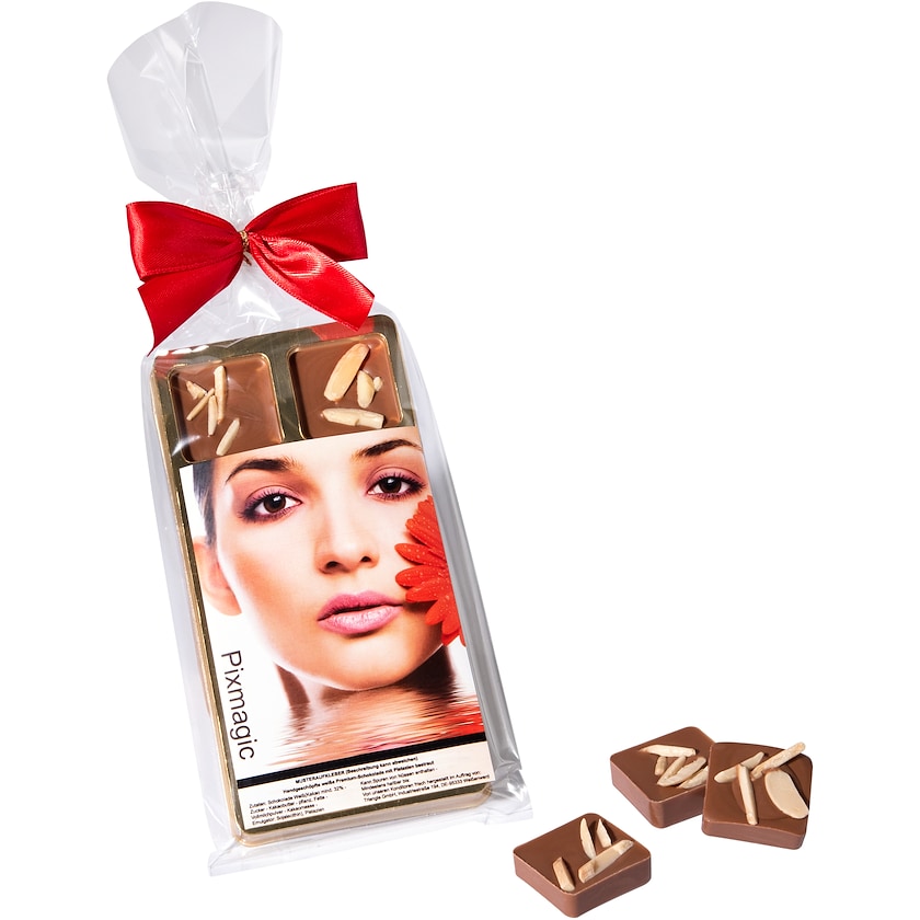 8 stk. håndlavede chokolade i pose med rød roset. Chokoladerne kan fås i nogle smagsvarianter som mælkechokolade med mandelflager eller mælkechokolade med pistacie. Chokoladerne er placeret i en guldfarvet blister æske. Trykket laves på blister æske.