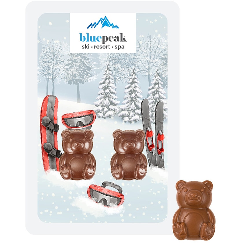 To søde bamser af mælkechokolade på et blisterkort. Kortet trykkes med digitaltryk helt efter dine ønsker. Alle børns favorit!