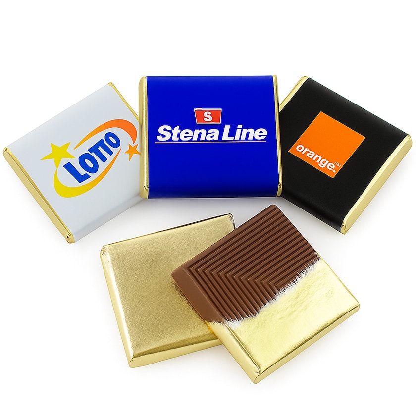 Belgisk kvalitetschokolade med digitaltryk fra kun 500 stk. Vælg mellem sølv- og guldfolie. Papiromslaget digitaltrykkes helt efter dine ønsker. En chokoladekvadrat med usædvanlig kort leveringstid.