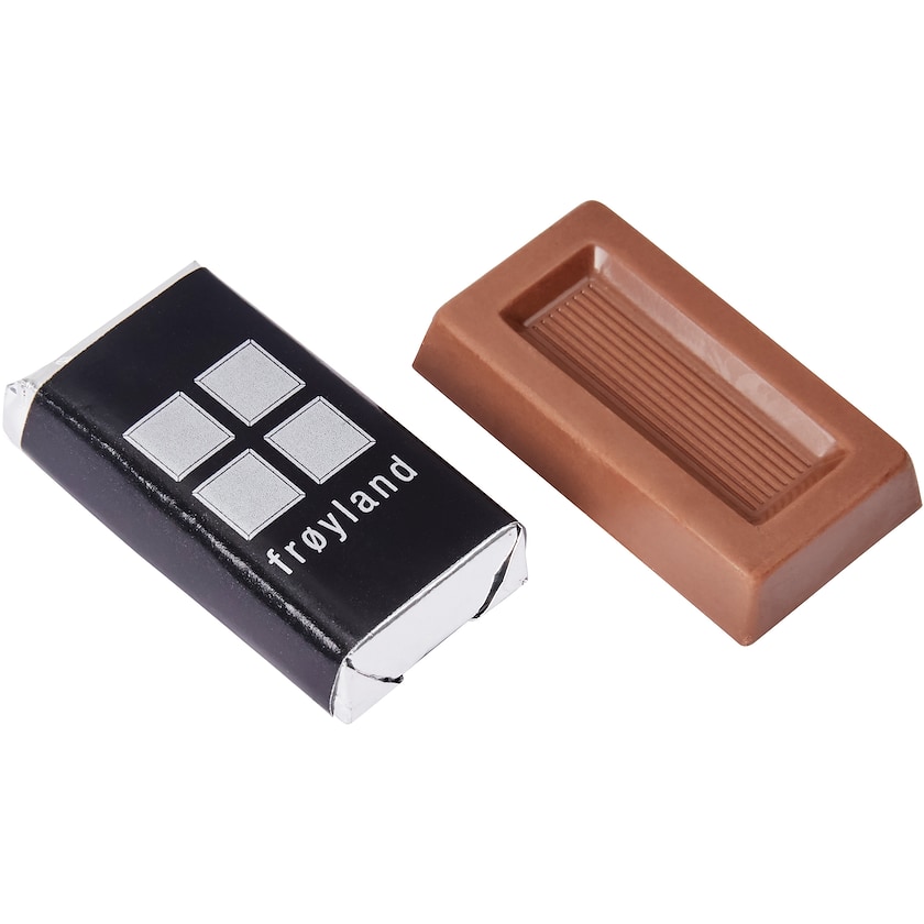 5 grams mælkechokoladeplader med digitaltryk fra kun 500 stk. Chokoladen er indpakket i sølvfolie med et papiromslag, som du helt selv designer. Leveringstiden er relativ kort, og er det perfekte valg til dig der ønsker chokoladen hurtigt leveret og i en lille kvantitet.
