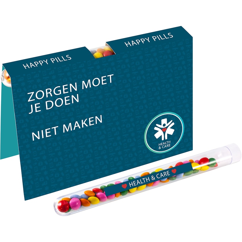 Reagensglas fyldt med chokoladeknapper fastgjort til et kort. Trykprisen henviser til digitaltryk på både reagensglasset og hele kortets for- og bagside.