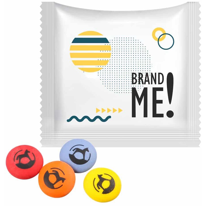 Chokoladeknapper med logo på både posen og chokoladeknapperne. Posen er fremstillet af biologisk nedbrydeligt materiale og indeholder 5 lækre chokoladeknapper. Posen trykket med digitaltryk. Tryk i sort og hvid farve på chokoladeknappernes for- og bagside er inkluderet i trykprisen. Reklameslik når det er bedst!
