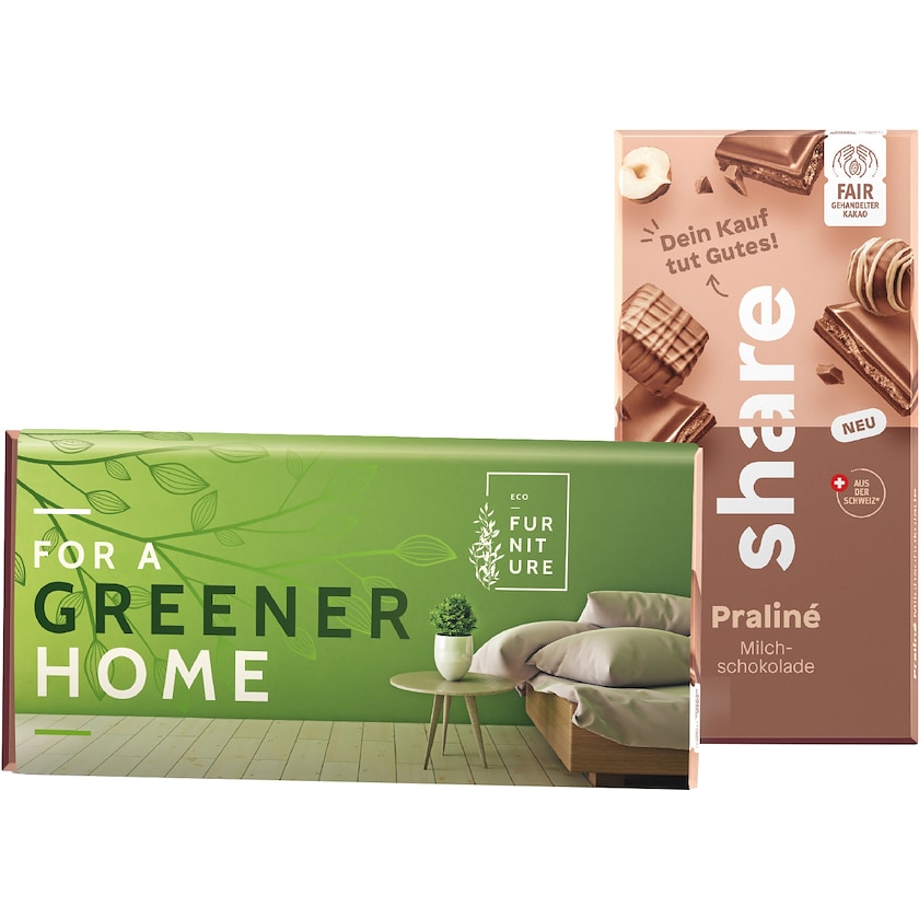 Klimaneutral og Fairtrade-mærket chokoladebar fra Share. Chokoladen er af højeste kvalitet og indeholder ikke palmeolie. For hver solgt chokoladebar donerer Share et måltid mad til et menneske i nød. Trykket laves på en banderol af FSC-certificeret papir.