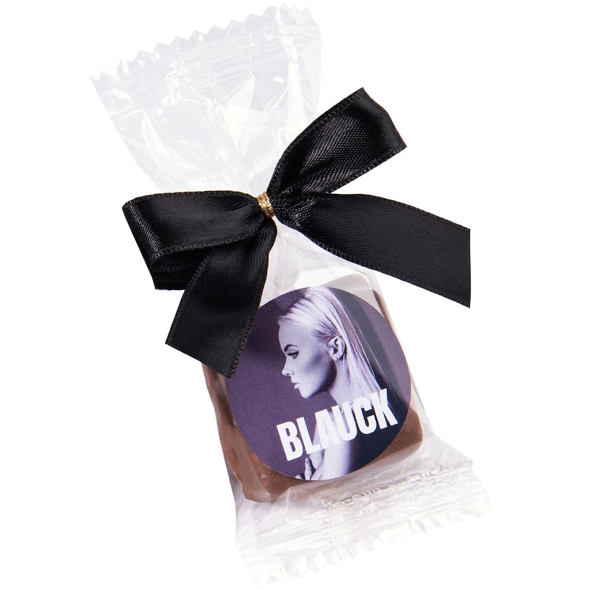 Chokolader i flowpack med sløjfe. Chokolader er fremstillet en lækker blanding af mandel og nougat som er overdækket med mælkechokolade. Et klistermærke med dit logo placeres på flowerpacken.