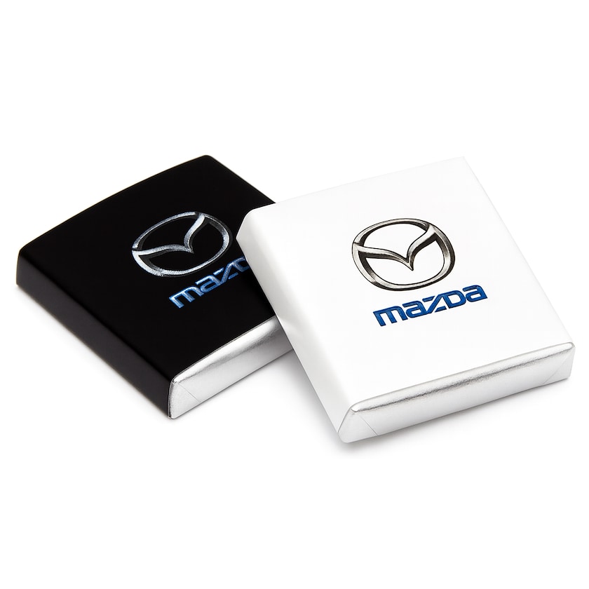 5 grams chokolade som kan købes fra 500 stk. Chokoladen fås i to lækre smagsvarianter. Papiret digitaltrykkes og folie er sølvfarvet.