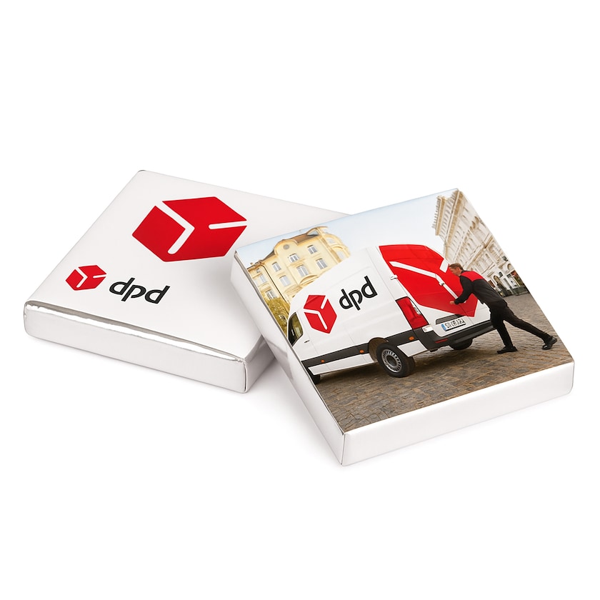 Chokolade rektangel af Fairtrade-certificeret økologisk chokolade. Vælg mellem mælkechokolade og mørk chokolade. Du vælger også selv om du vil have sølv- eller guldfarvet folie.