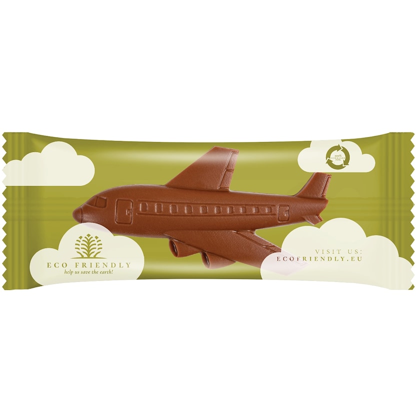 Chokolade formet som en flyver i biologisk nedebrydelig emballage. Vælg mellem tre forskellige smage. Hele emballagen trykkes efter dine ønsker.