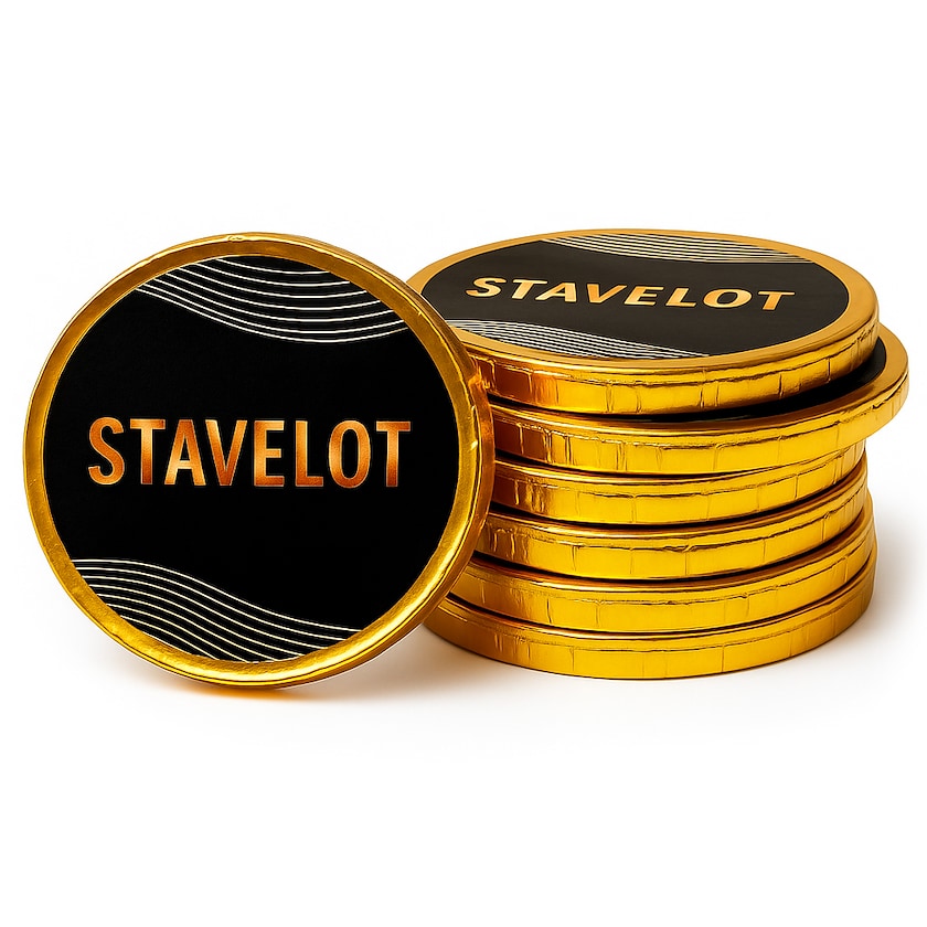 Chokolademynte med guldfolie. En rund etiket med dit tryk placeres på frontsiden. Kommer i smagsvarianterne mælkechokolade og mørk chokolade.