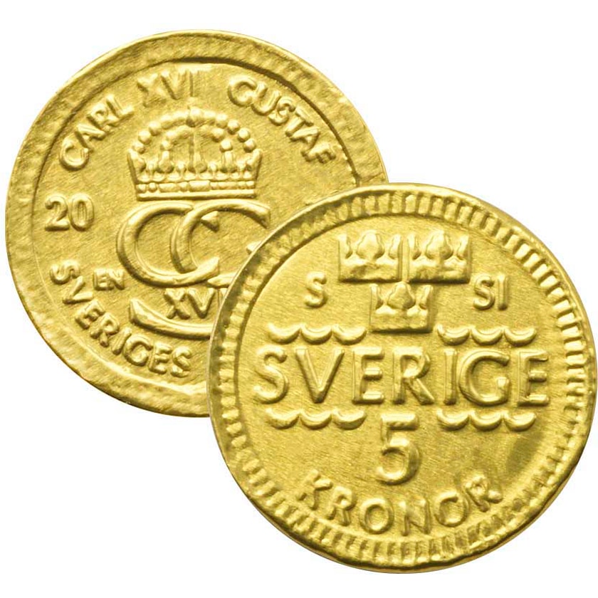 Chokolademønt formet som en svensk femkrone. Chokolademønten er lavet af lækker mælkechokolade med mindst 28& kakaoindhold.