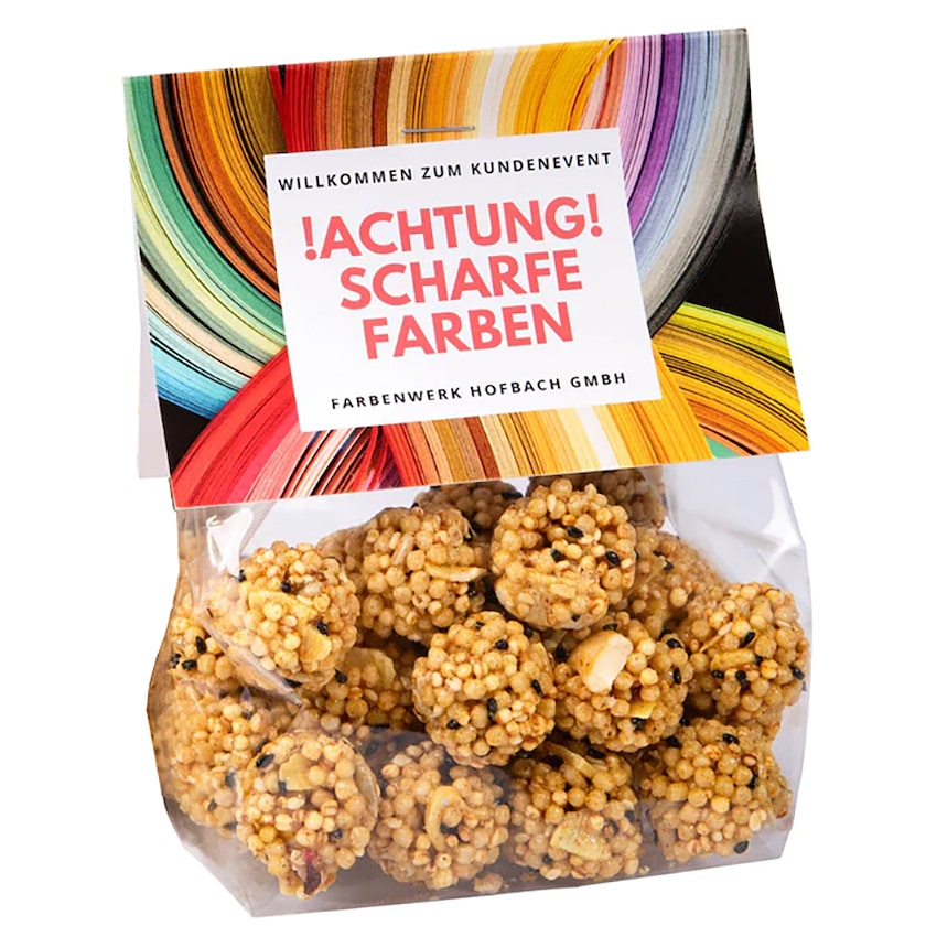 Stor pose med müslikugler med et kort i toppen til dit tryk. Müslikuglerne er lavet af quinoa, kokos, sesamfrø og solsikkefrø og er krydret med karry og en knivspids chili. Et sundt alternativ til chips, slik og chokolade.