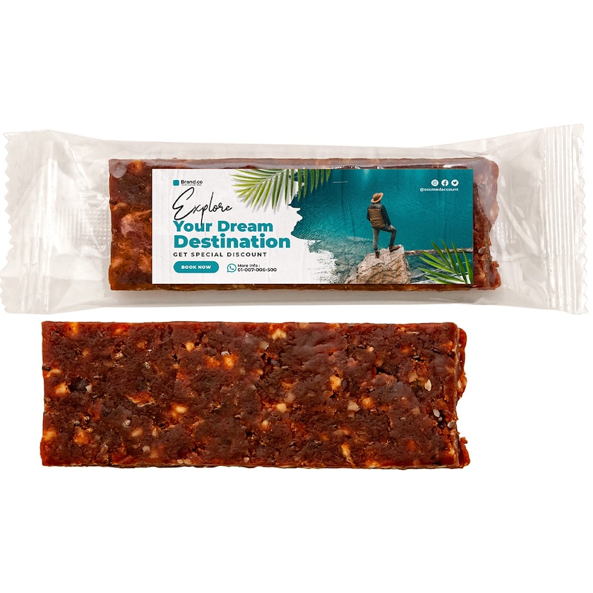 Frugtbar lavet af dadler, nødder og chiafrø. Ceri har et 100% naturligt indhold uden tilsat sukker. Trykket laves på en etiket som placeres på topsiden.